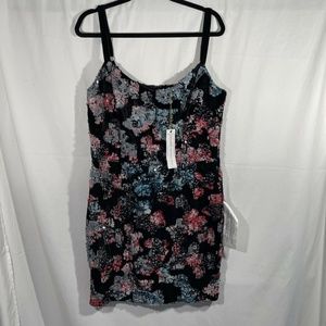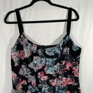 Colorful sequins create a shimmering abstract-floral pattern on this slinky mini sheath adding a touch of romance to this ready-to-party dress.