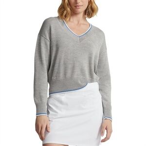 This RLX Ralph Lauren women's golf sweater is a must-have for any fashion-conscious golfer. With its stylish V-neckline and long sleeves, this sweater is perfect for cooler weather on the course. Made from a comfortable blend of polyester and wool, it is both warm and breathable, ensuring that you stay comfortable throughout your game. The gray color and RLX logo accents add a touch of sophistication to this versatile sweater, making it suitable for both casual and formal occasions. Available in XS and medium sizes, this sweater is a great addition to any golfer's wardrobe.