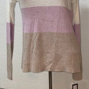 Brand new, still has tags. Gray, white, purple and brown pullover color block sweater from KINROSS. Size 2, which would be Small. Retails for $254.