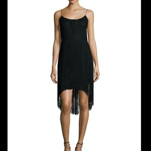 Aidan by Aidan Mattox cocktail dress combines lace bodice and fringe skirt.