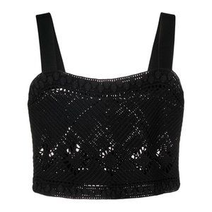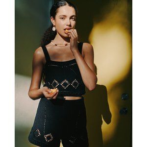 Maje black crochet knit top. Maje merges its free-spirited aesthetic with vintage-inspired detailing for SS23. Boasting a structured silhouette, this