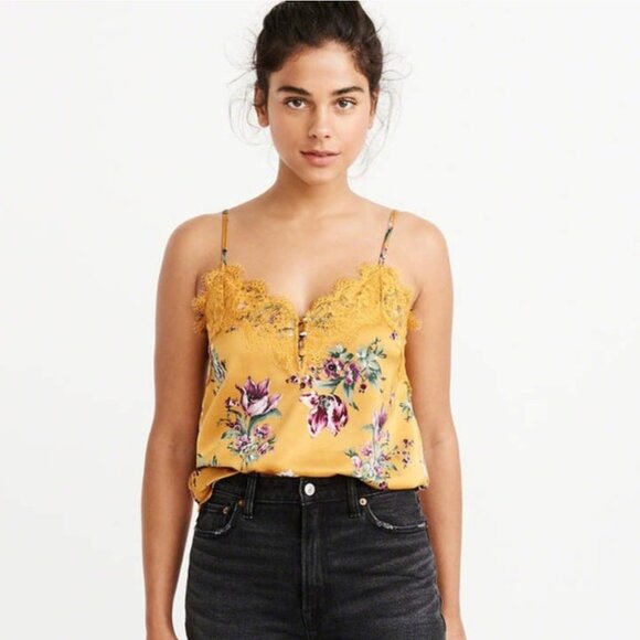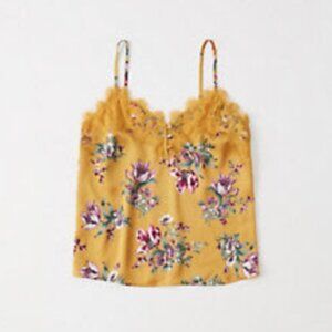 NWT $28 A&F Lace-Trim Satin Cami in YELLOW FLORAL - XS!