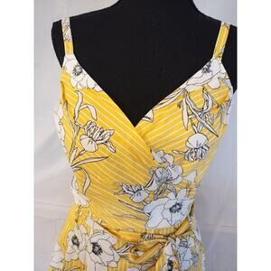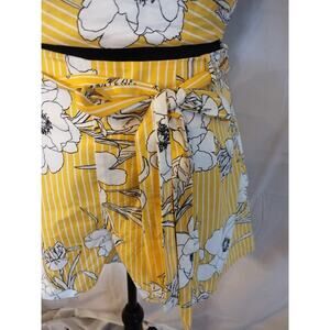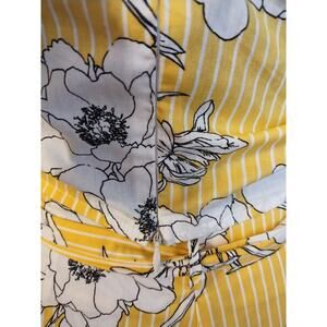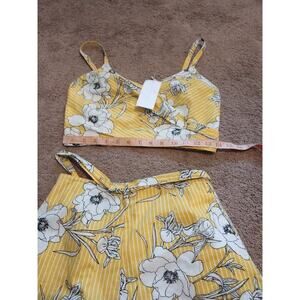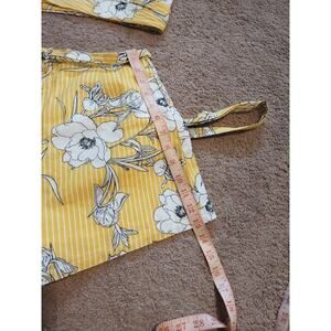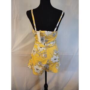 This NWT 2-piece sleeveless romper set by LUSH in yellow, white, and black floral pattern is perfect for casual occasions. Made from 100% cotton fabric, this size small set includes a top and shorts, featuring a stylish romper style design. The vibrant floral theme adds a touch of femininity to this fashionable two-piece outfit for women, making it a must-have addition to any wardrobe. The top has an overlap bust. The waist is 27" and is 13" long from waist to hem.