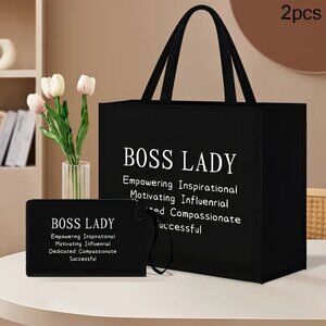 NWT 2pc Black Tote & Makeup/Pen Bag with Boss Lady Text Set