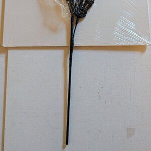 Spooky NWT black glitter skeleton hands floral pick by Michael's Ashland Halloween collection, with bendable stems. This sparkly and eerie floral accessory measures approx 5" tall for each hand in the 'bouquet', 23" total with pick, and is in perfect new with tags condition. Awesome for making scary haunted house props, Halloween-themed wreaths, or other freaky Samhain home decor. A spooky goth, Halloween and Dia de los Muertos decoration :)