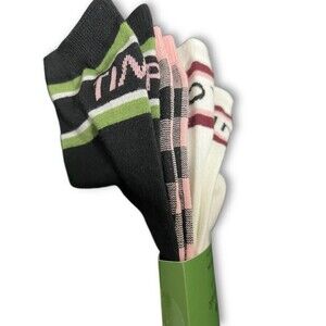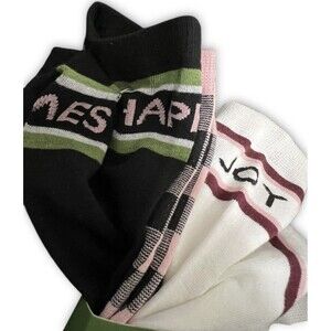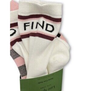 New with tags. 3 pairs of ankle length, lightweight Kate Spade socks. Ivory pair with find and joy across the ankle and head over heels written along the bottom in gold. Black pair with happy and times across the ankle and a pink and black gingham patterned pair. Womens size 4-10