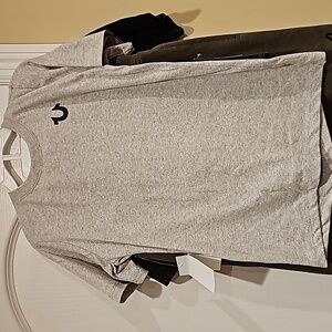 Gray shirt logo in feont and back says True Religion crafted with pride as shown in pic.