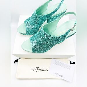 NWT 3.1 Phillip Lim Salma Glitter Platform Leather Sandals in Mint Blue 9.5 39.5