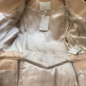 Zippered welt pockets at front. Padded and zippered peplum details at side hem. Padded back panel with zippered vents at back hem. Zippered sleeve cuffs. Fully lined.