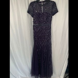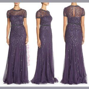NWT $318 Adrianna Papell Beaded Mesh Godet Gown in Prune‎ Purple [SZ 2 ]