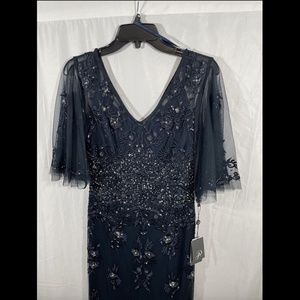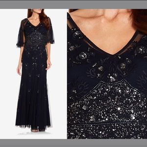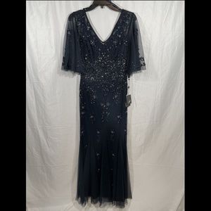 NWT $349 Adrianna Papell Floral Beaded Gown Flutter Sleeves Midnight [SZ 0 ]