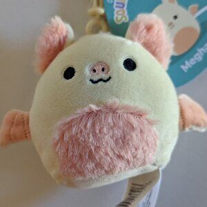 Spooky 3.5" collectible Squismallows Meghan the fruit bat mini plushie purse, bag or backpack clip, white with pink detail, with fuzzy ear linings and belly. This freaky collectible little Squishmallow stuffed animal is in perfect new with tags condition. An eerie Halloween, goth and Dia de los Muertos new wardrobe accessory, and to bring trick or treating!