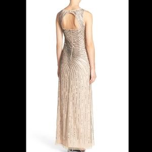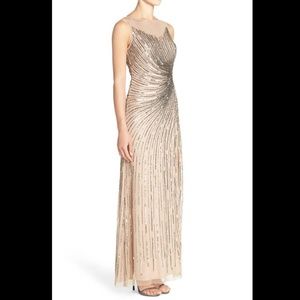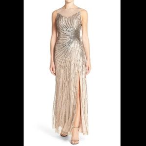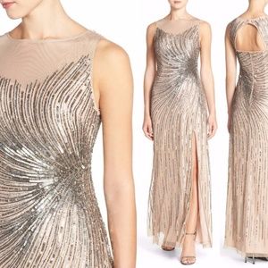 NWT $359 Adrianna Papell Embellished Mesh Slit Gown Taupe/Pink [SZ 4 US ]