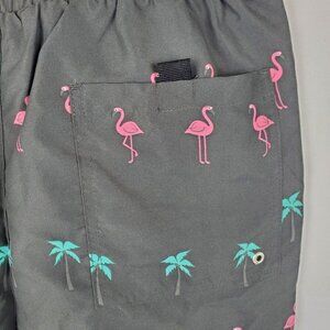 NWT 360 Surf Men's Beach Shorts Black w/ Flamingo and Palm Tree Recycled Poly
