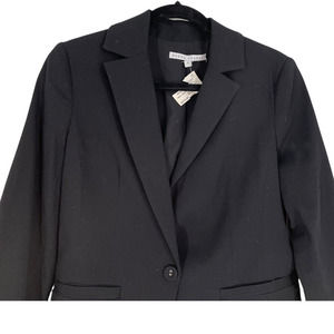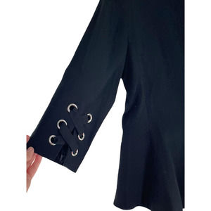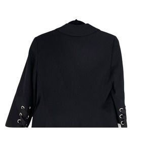 BEAUTIFUL BLACK DONNA DEGNAN TWO-BUTTON BLAZER WITH RIBBON TIE SLEEVES. A CLASSIC FOR YOUR CLOSET. THIS BLAZER WORKS WELL WITH A VARIETY OF LOOKS, INCLUDING THOSE THAT ARE CASUAL AND FOR THE OFFICE. IF YOU'RE LOOKING TO ACHIEVE A RELAXED YET REFINED APPEARANCE, THIS BLAZER CAN MAKE A PERFECT CHOICE.