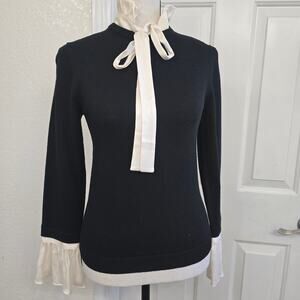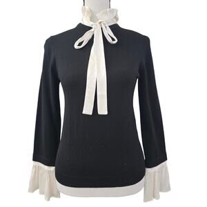 NWT $395 Alice + Olivia Wool Silk Bow Tie Sweater XS Black Ruffle Quiet Luxury
