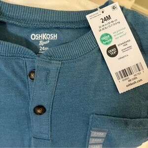 3) NWT OshKosh B'gosh blue t-shirt: 2 brown buttons at top, fabric label patch, breast pocket, 60% cotton, 40% polyester