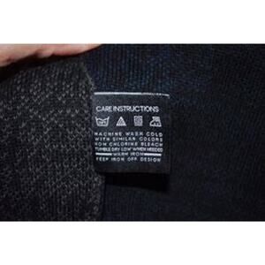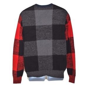 "Lumberjack Sweater". Warm, tight-weave. 100% cotton knit with ribbed cuffs and crew neckline. Rich, dark blues, reds and blacks on the front and black, grays and reds on the back in an appealing block type pattern. Machine washable; follow care instructions carefully. Well-made with nicely finished seams.