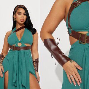 Warrior Maiden 4 PC. Costume by Leg Ave Includes; gauzy layered peasant style maxi dress, embroidered detailed headband, a faux leather asymmetrical shoulder harness with o-ring belt buckle closure and matching lace-up arm cuffs.