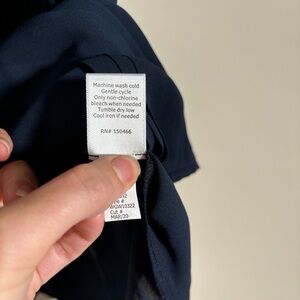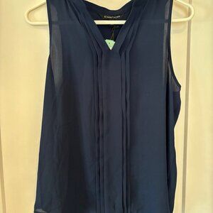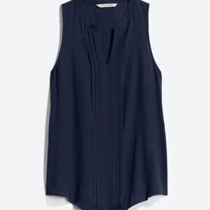 Size small navy blue sleeveless blouse by 41 Hawthorn. Front split neck and pleated detailing on front and back. Brand new item with tags. 100% polyester.