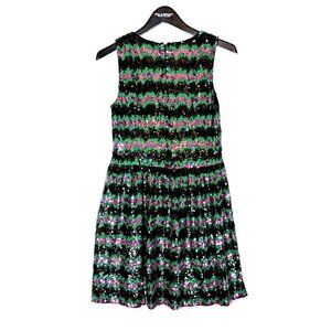 Brand new with original tags. MSRP $448. Size 6. All hand-sewn sequins in a classic Mardi Gras colorway with black lacey trim, a simple crew neck with zippered back and a cute fit and flare style. Mini length hits above the knee. Black slip underneath for added comfort.