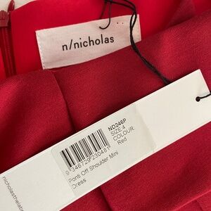 The NWT $495 N NICHOLAS Red Ponti Off Shoulder Mini Party Cocktail Dress in size 4 is a stunning piece perfect for weddings, cocktail events, parties, and formal occasions. Made from a polyester blend knit fabric, this dress features a solid red color, off-shoulder neckline, and a zip closure. The fit and flare style, above knee length, and off-shoulder design make it a stylish and elegant choice for the summer and spring seasons. Made in Australia by the N Nicholas brand, this dress is a sophisticated addition to any woman's wardrobe.