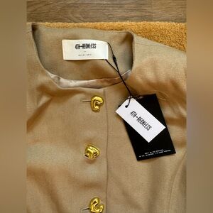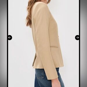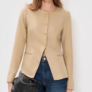 The 4th & Reckless Polly Blazer is a tailored blazer with padded shoulders and long sleeves. It features a crew neck, button placket, and faux front pockets. The blazer is crafted from lightweight, non-stretch twill with a shell of 100% polyester and is fully lined. It is embellished with gold-tone sculpted buttons. The blazer measures approximately 24.75in / 63.0cm in length, from shoulder.