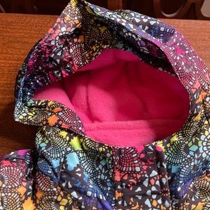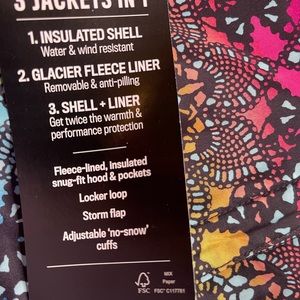 three jackets in one 3 in 1 winter coat jacket parka jacket in a jacket inside a full pink fleece zippers out separately (I have a few matching snow pants snow bibs listed in a separate listing - sep pricing on those ) water wind resistant zippers and velcro front double closing Adj elastic no-snow cuffs fleece liner jacket comes out Storm flap storm cuffs hook-and-loop closures
