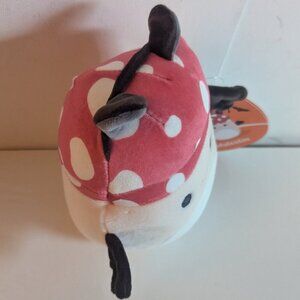 Spooky 5" collectible Squishmallows Malcolm the Halloween mushroom bat, featuring a pink and red spotted mushroom with black bat wings and bat ears attached headband. This eerie mini collectible Squishmallow plush toy is in perfect new with tags condition. A scary and cute Halloween, Samhain or Dia de los Muertos decoration, great goth home decor, or add to your collection!