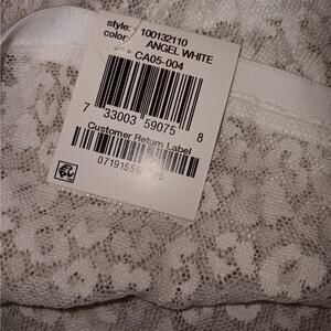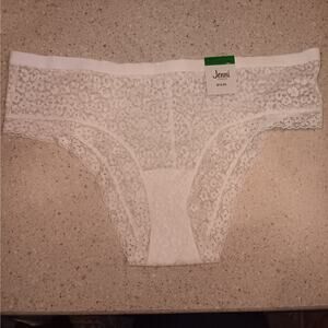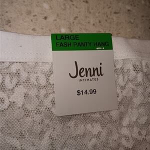 One pair of Jenni lacy white panties. The body of the panties is made of 86% nylon and 14% spandex. They have a 100% cotton crotch. Retail for $14.99.