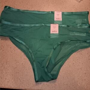 Two pairs of Auden solid sheer green cheeky panties. They are made of 91% nylon and 9% spandex and 100% cotton crotch. Retail $7.00/each.