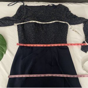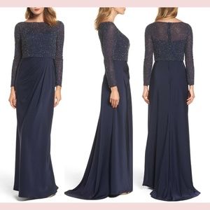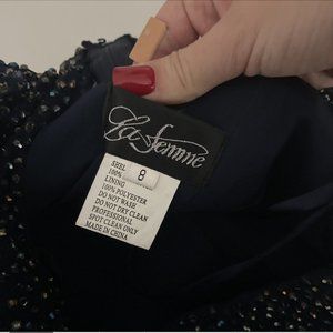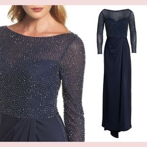 NWT $508 La Femme [ 8 ] Long Sleeve Beaded Column Gown in Navy #Q255