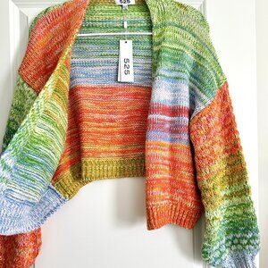 Details: vibrant orange, yellows, blues, lime to Kelly green, light pink and red, drop shoulders, long balloon sleeves, ribbed cuffs, relaxed oversized fit, open front, cropped back, chunky ribbed knit fabric, mid-weight. Gorgeous!!!