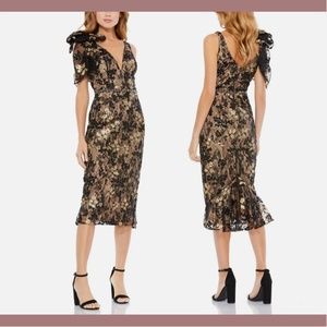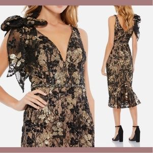 NWT $538 Mac Duggal [ 16 ] Bow Floral Embellished V Neck Midi Dress Black Lace