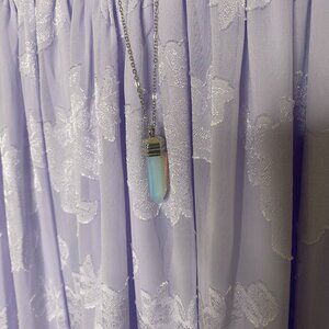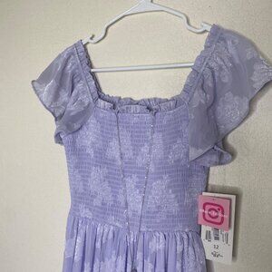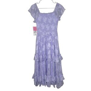 Lightweight lilac dress with a smocked bodice and tiered ruffles, offering a delicate floral design. Includes a coordinating necklace for added charm.