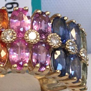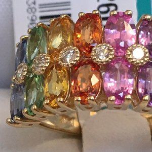 The colored stones are all loupe clean and transparent, and measure 4 x 3.5 mm, approximately, prong-set. The diamonds are bezel set in migrain settings, measure approximately 1.5 mm in diameter. The total length top to bottom is 10 mm. The rainbow reaches down the side of the finger. The polished gold band gradually narrows to 3 mm at the bottom of the finger. This is a really nice versatile style that is somewhat attention-getting but not over the top, suitable to be worn everyday as well as on a special occasion.