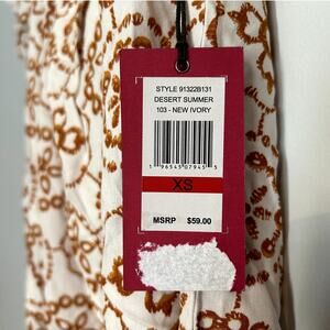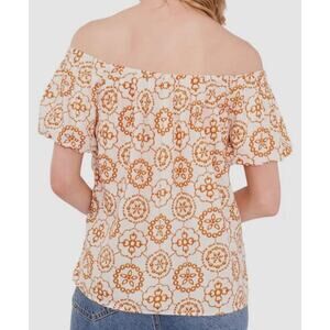 Keywords: Vince Camuto blouse, off shoulder top, puff sleeve blouse, summer blouse, orange ivory print, lightweight top, XS blouse, casual chic, trendy tops, vacation wear, boho style, warm weather fashion.