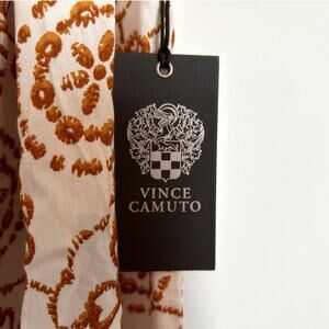 This chic off-the-shoulder blouse by Vince Camuto features playful puff sleeves and a stylish orange and ivory print, perfect for summer outings or casual brunches. Lightweight and breezy with a flattering neckline, this top blends comfort and style effortlessly.
