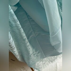 The Alice and olivia Charlize smart lace maxi dress in Powder Blue features a V-neck line, short sleeves, and a small bodice. The dress is made of lace with scalloped eyelash trims and is fully lined. It has a concealed zip fastening along the side. The dress is made of midweight non-stretchy fabric and is dry clean only. The dress is ankle length.