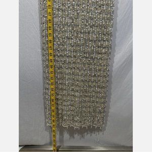 Hand-beaded geometric gown adorned with crystal drop accents through the dress. The full-length skirt features a center back slit, and the spaghetti straps are lined with metallic sequins.