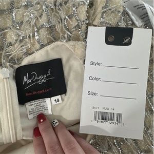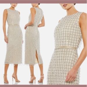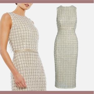 NWT $598 Mac Duggal [ 14 ] Crystal Drop High Neck Beaded Midi Sheath Dress Nude