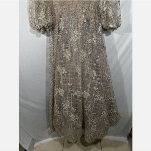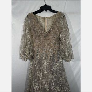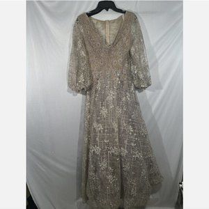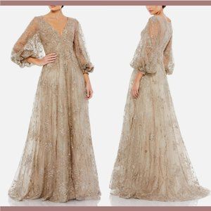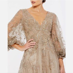 NWT $598 Mac Duggal [ 8 ] Embellished V-Neck Puff Sleeve A-Line Gown Mocha #Q524