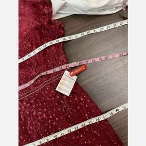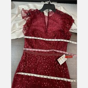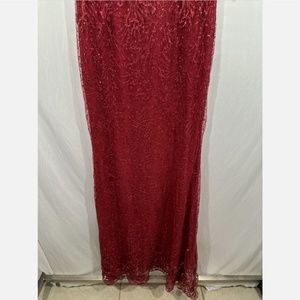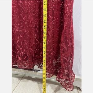 Deep red evening dress features a slim-flare silhouette in beaded lace over a solid lining