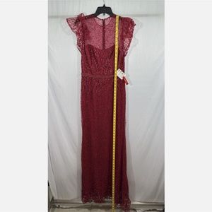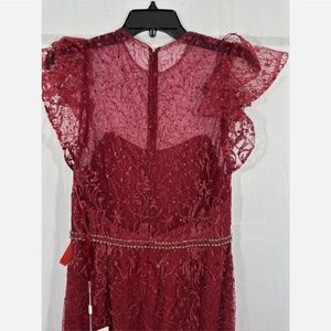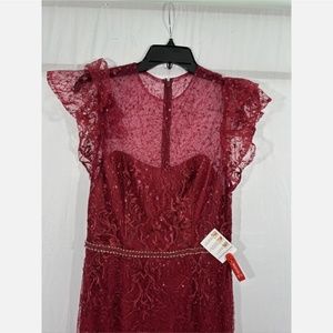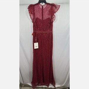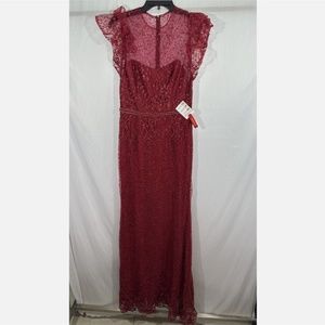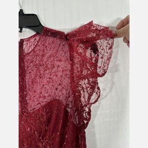 NWT $598 Mac Duggal [ 8 ] Ruffle Sleeve Illusion Neck Beaded Lace Gown Red
