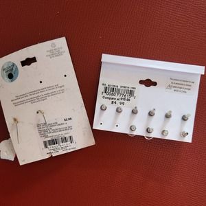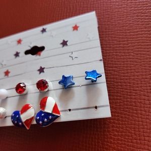 6 pairs of USA patriotic earrings. 1 pair marked hypoallergenic. All NWT. Red, White & Blue colored stars, hearts, circles and cupcakes. 5 pairs stud post and 1 pair hooked dangle.