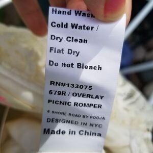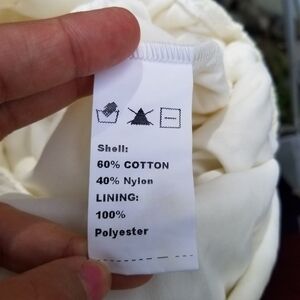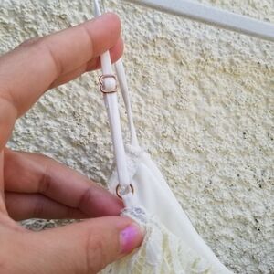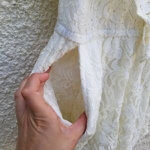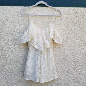 Cute spaghetti strap romper with a cold shoulder/off the shoulder ruffle detail. Has a solid underlayer and then a crochet lace overlay - the cold shoulder detail is just the lace overlay. Straps are adjustable. Elastic waist. Has pockets! See photos for fabric and care details. Not a bright white - more of an ivory color. Fabric provides stretch.