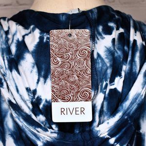 NWT $62 River Tie-Dye Hooded Blouse S, Blue & White 3/4 Sleeves, Loose Fit Flowy