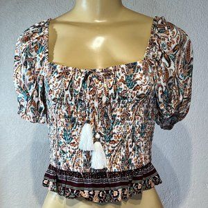The painterly paisley print of the "What I Got" crop top will wrap you in dreams of a boho summer. A smocked bodice and puffed sleeves up the romance of this figure-hugging top.