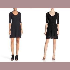 Ribbed texture and sheer detailing define the modern allure of a classic fit-and-flare dress in a fine Italian knit.