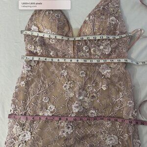 This elegant gown features a plunging illusion neckline with sheer mesh inset, scoop back, and a sexy fit-and-flare silhouette. Mesh overlay features allover embroidery. 3D floral applique, and heat-set crystals. A beautiful hand-beaded belt accents the natural waist.